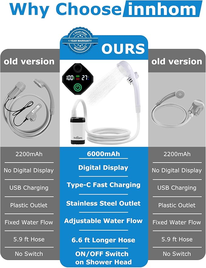 - Upgraded 6000mAh Battery & 140 Minutes Runtime: innhom portable shower for camping has a 6000mAh battery capacity and can work continuously for 90-140 minutes on a full charge in 4-6 hours. Our portable camping shower can be charged by a type-c charging cable, which makes it easy to charge with cell phone charger (5V-2A), mobile power, laptop, AC adapter, car USB output and more.