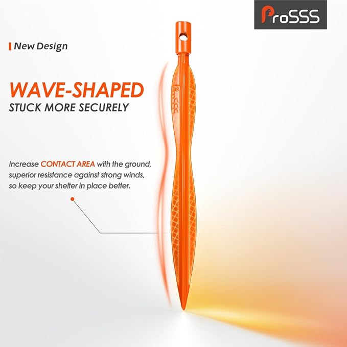 - 【7" Wave-Shaped Body Design】These tent stakes have unique wave-shaped body design to increase contact area with the soil, so compared to other regular triangular Y-shaped stakes, we offer superior resistance against strong winds, making it the perfect choice for your outdoor camping needs. Whether you're pitching your tent in a windy or rainy conditions, our Camping Stake will keep your shelter in place better.