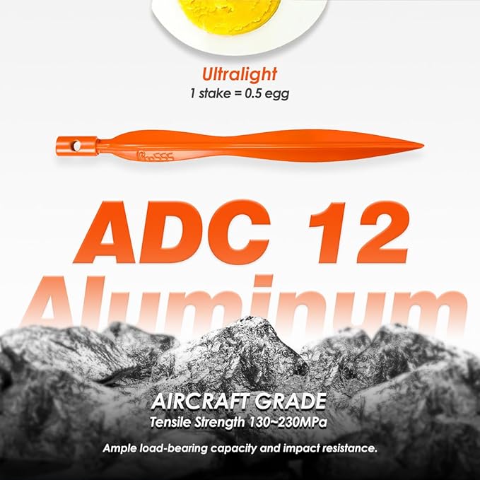- 【Heavy Duty Material】Camping Stake is crafted from high-quality ADC12 aluminum, which providing it with ample load-bearing capacity and impact resistance despite its lightweight design. This material is known for its exceptional corrosion resistance, ensuring that your stakes remain in perfect condition even in harsh environments.