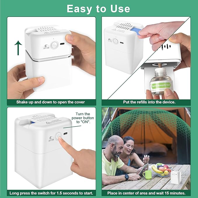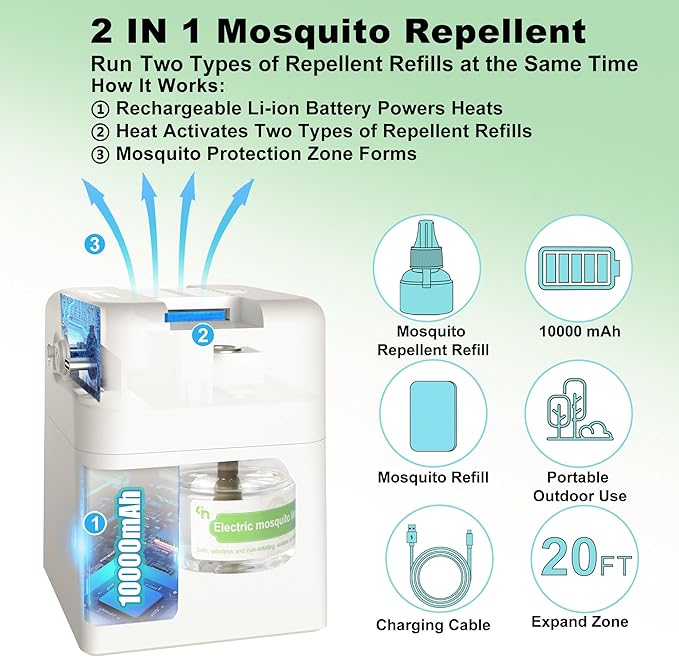 - 【EFFECTIVE MOSQUITO PROTECTION】 Q5 Rechargeable Mosquito Repeller creates a 20-foot mosquito protection zone by heating the effective repellent ingredient. One-button to keeps mosquitoes away. Perfect for the patio, backyard, poolside, decks, porches, camping and other indoor outdoor activities.