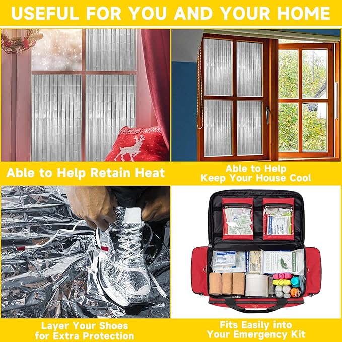 - 【Space Blanket Survival kit Camping Blanket】Each survival blanket is individually folded, wrapped, and sealed for easy storage and retrieval. They are reusable, waterproof and windproof and can also be used for both ground cover and shade. Durable and advanced aluminized dual-sided Mylar blankets are perfect for conserving body heat in emergency survival situations. And, Mylar insert provides insulation and the foil cover can reflect heat back to the body or deflect heat from the sun.