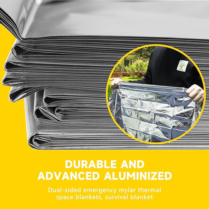 - 【EMERGENCY BLANKETS】Durable and advanced aluminized dual-sided thermal blanket, Mylar blanket, emergency blankets or space blanket. The sheet blankets retains up to 90% of your body heat to keep you warm in the winter nights. Our durable advanced aluminized Mylar blankets are perfect for civilian bug out bags, go-bags, and home/auto emergency kits. Pack for tornado shelter.