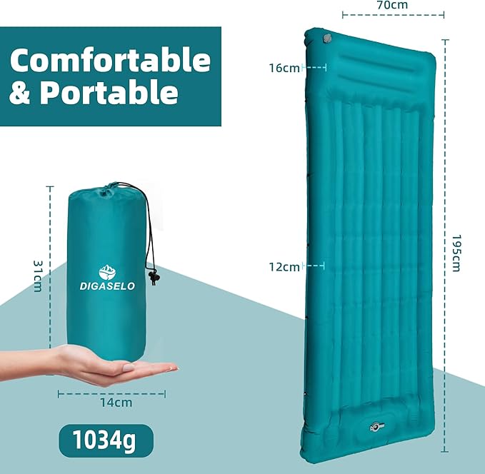 - 🏜️【LIGHTWEIGHT AND PORTABLE】Our mattress pad are designed to accompany you on any type of adventure, with an inflated size of 77 inches X 27.5 inches, giving you the comfort you need. Built-in pillows provide support for your head and neck without the need for additional camping pillows to add weight to your bag. It weighs only 2.53 pounds and is easy to carry.