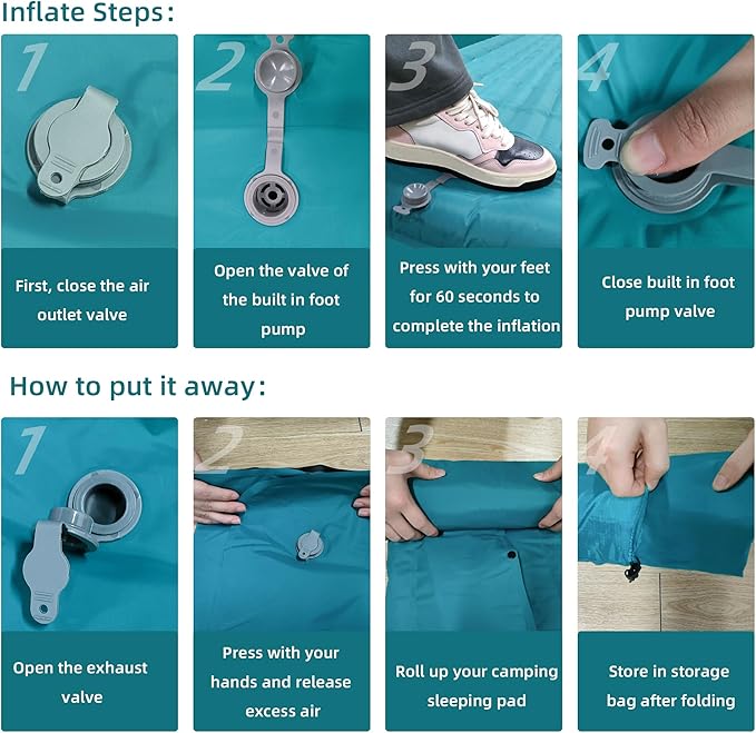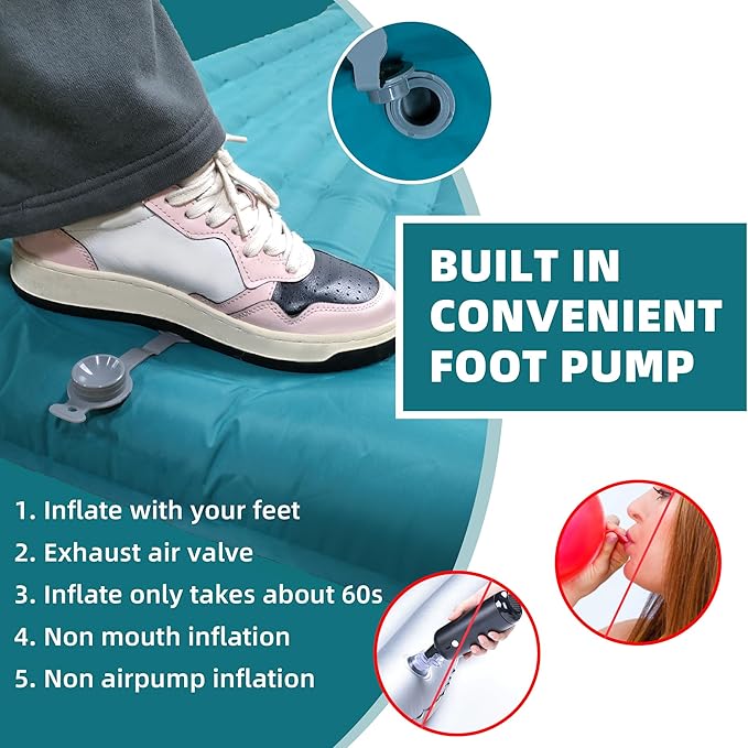 - 🏜️【Easy Inflate and Deflate】No more blowing your air mattress camping with your mouth! It has a built-in foot pump that allows you to inflate it in less than 50 seconds. Just open the deflation valve and the air will be deflated in 1 second. You can adjust the hardness of the mat by adding or releasing air as you like.