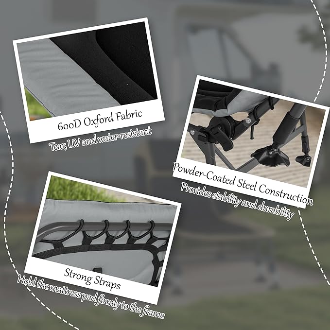 - Camping Ready: Swiveling tripod feet prevent our portable bed from sinking in loose ground. It features a strong steel frame with a powder coat to endure water without issue. Its surface is made of rugged, 600D Oxford fabric, helping it resist tearing when your adventure includes rough conditions.