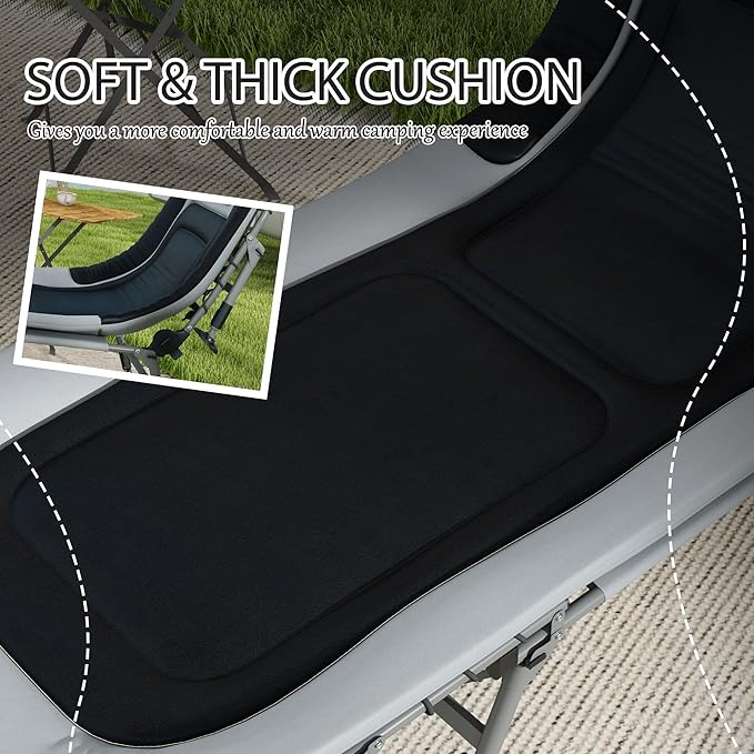 - Soft, Cushioned Camping Bed: Wake up refreshed, sleeping on a surface that's kind to your head and neck. Raised up off the ground with a soft, cushioned surface and a pillow to pad your head, our camping cot is built to bring you a higher level of comfort even on rough terrain.
