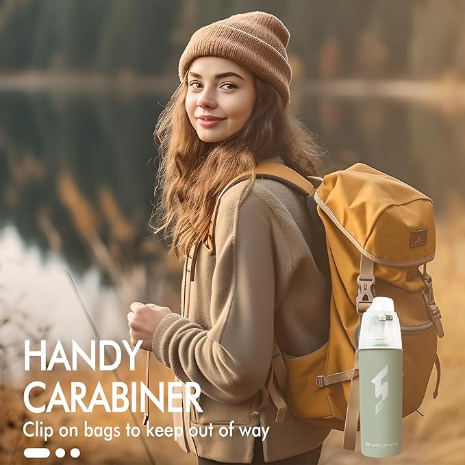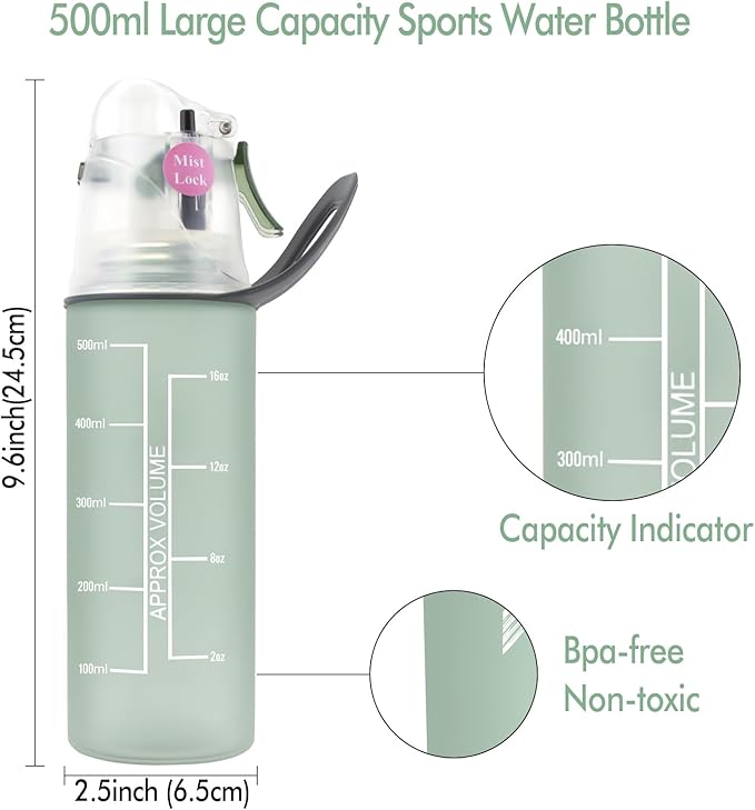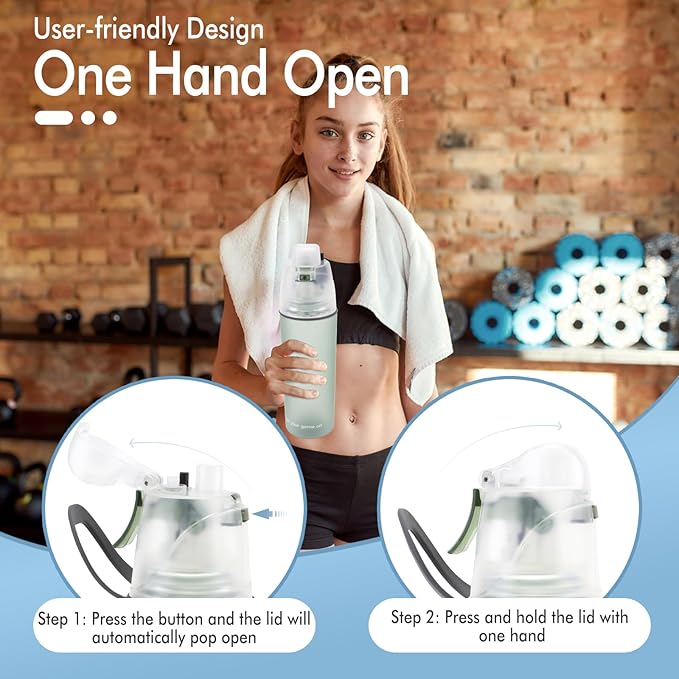 - PREMIUM QUALITY DESIGN AND EASY TO USE: Our Misting Sports Bottle is stylish and convenient to use. The special spill-proof top swings open with a One-Click push of a button! An air hole placed on the lid ensures fast flow of water with effortless drinking. It is ergonomically shaped to make one-handed use, with a portable PE handle and PP drink cap which protect the water from the dust and dirt.