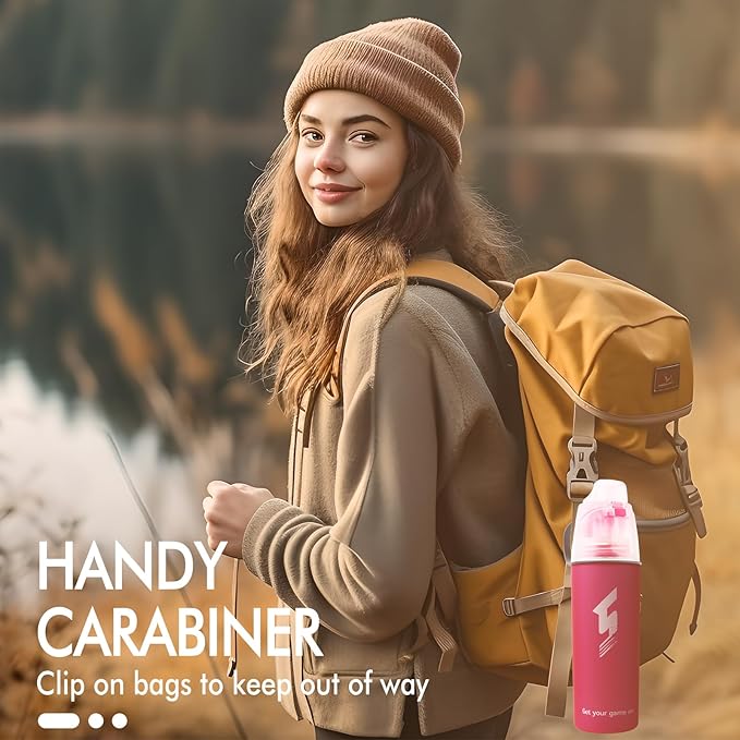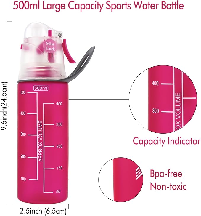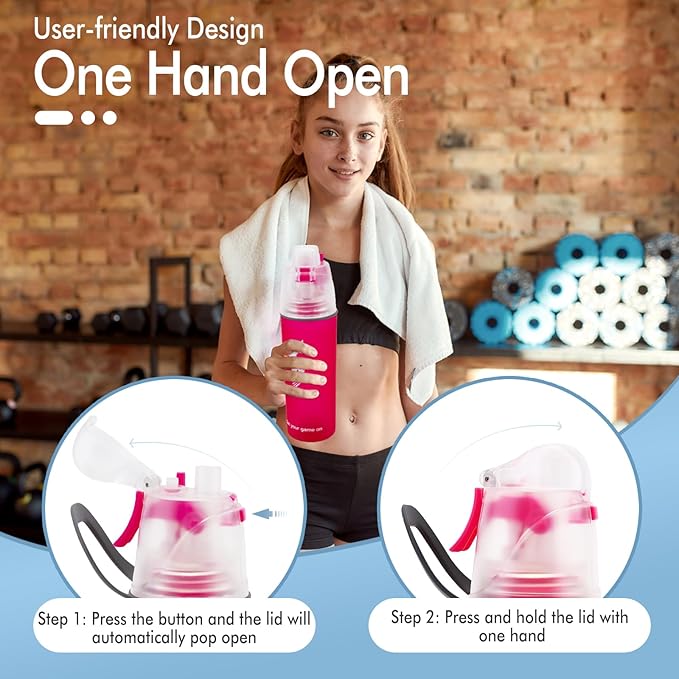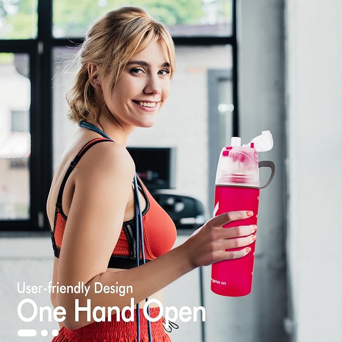 - PREMIUM QUALITY DESIGN AND EASY TO USE: Our Misting Sports Bottle is stylish and convenient to use. The special spill-proof top swings open with a One-Click push of a button! An air hole placed on the lid ensures fast flow of water with effortless drinking. It is ergonomically shaped to make one-handed use, with a portable PE handle and PP drink cap which protect the water from the dust and dirt.