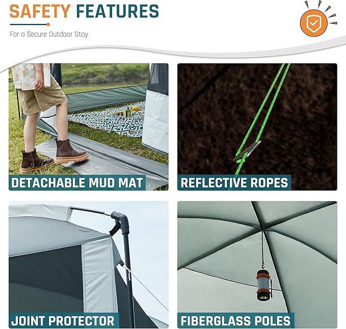 - Safety Features for a Secure Outdoor Stay: We've included safety features to ensure worry-free outdoor experiences. Step mats at the entrance helps to prevent trips and falls, while reflective wind ropes enhance visibility in low-light conditions. Our screen house for camping is designed with your safety and convenience in mind.