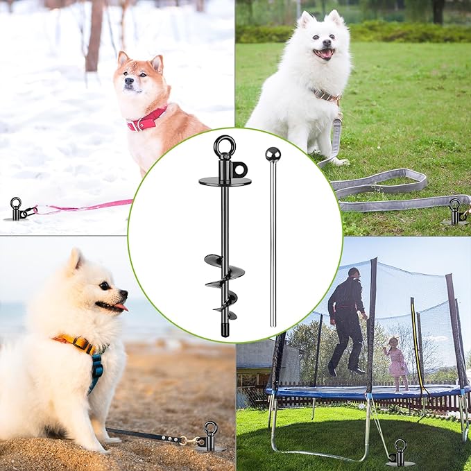 - 【KEEP YOUR DOG SAFE AND FREE】Our dog tie out stake is designed to securely anchor your dog in any ground condition, such as rocky, clay or sandy soils. It has a spiral blade that is welded and tapered to ensure a firm grip on the ground, preventing your dog from pulling it out and roaming around freely and safely.