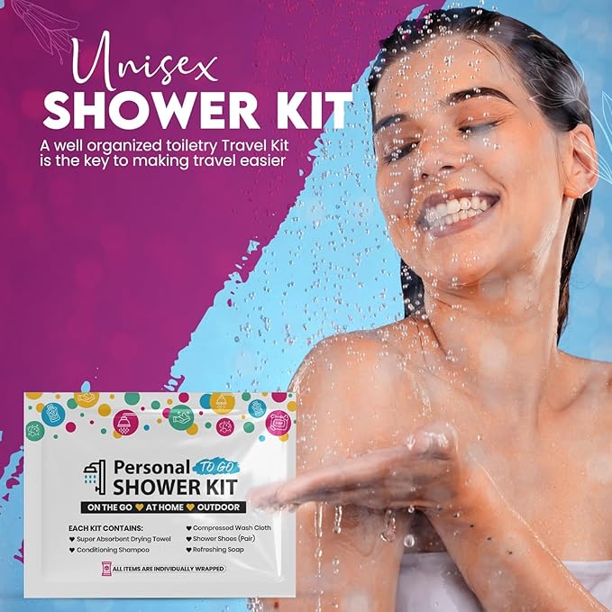 - ALL THE ESSENTIALS YOU NEED: Each Individual Pack comes with: 1 Conditioning Shampoo, 1 Bar of Soap, 1 - Compressed Wash Cloth, 1 - Pair of Shower Shoes and 1 - Drying towel packed together in a convenient to carry plastic zip lock bag.