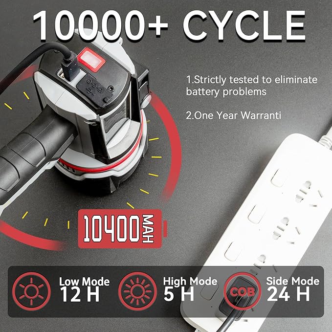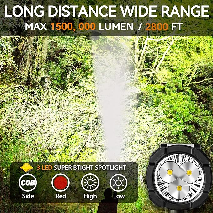 - 【Super Bright & Long Lasting Spotlight】Unique 3 x P50 Chip can generate up to 1500,000 lumens light output. Irradiation distance is about 2800 feet. Pure aluminum light cup to ensure stable temperature, brightness will not decrease with time. Low Mode:12H High Mode:5H Side Mode:24H.