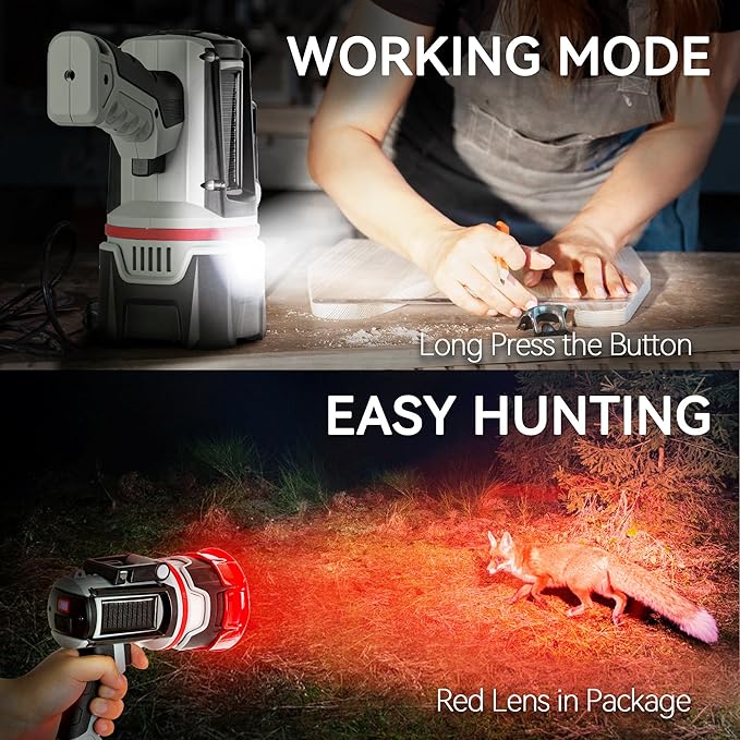 - 【Side Mode & Red Mode】The side lights can be turned on by long pressing the switch, it could last 24 H, which is suitable for repairing or other activities that require prolonged lighting. Inside this hunting spotlight box, there is a high-quality red lens that can shine 650K of red light when put on, suitable for hunting, observing wildlife, or SOS.