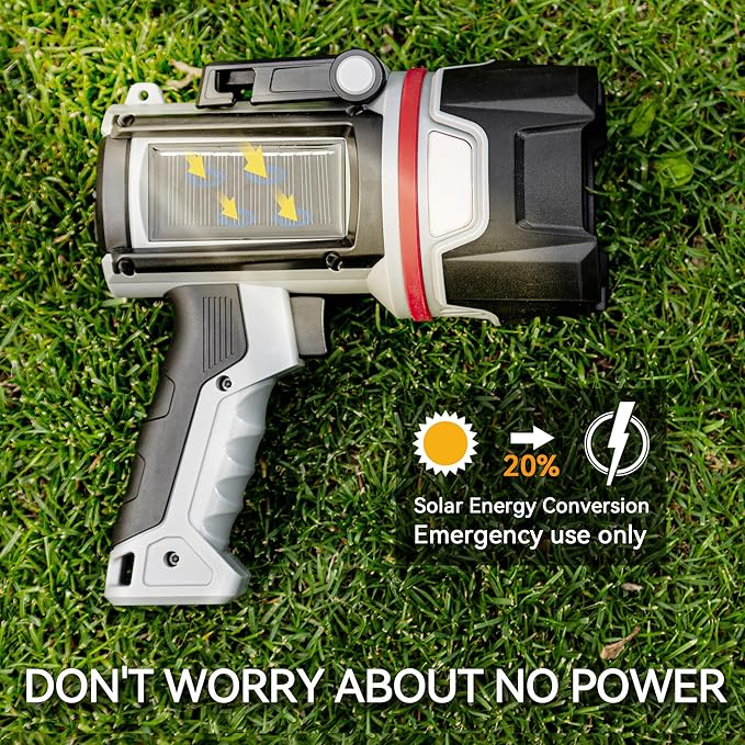 - 【Multiple Charging Ways Handheld Spotlight】Built-in 10400mAh high capacity rechargeable battery, support 5v 2A fast charge(4-6 H). And there are solar panels on the side of the lamp, which have a high conversion rate of 20%. The sun shines for about 20 hours, the electricity will be fully charged. Recommended for emergency use.