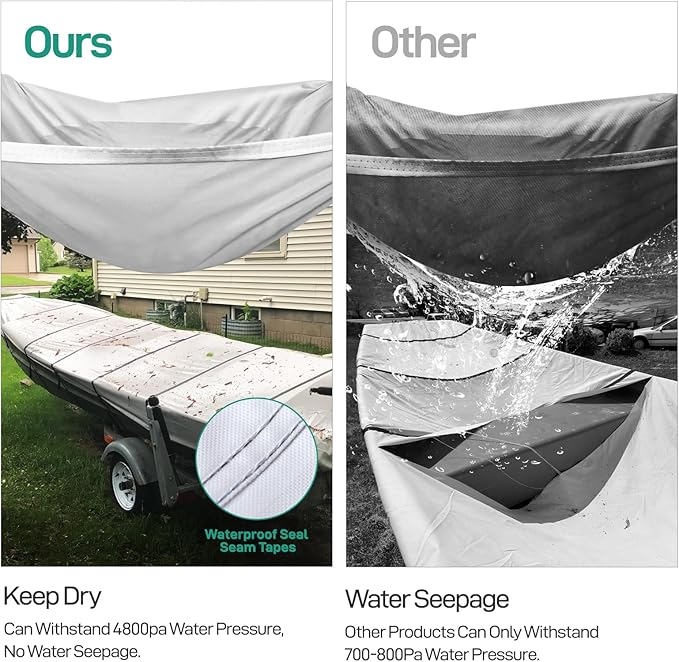 - [100% WATERPROOF BOAT COVER]Caminor 18 feet Jon Boat Cover can withstand water pressure of up to 6000 Pa. Its 4-layer waterproof coating on the back of the cover ensures that it is more waterproof than other Jon boat covers on the market. Plus, its waterproof sealing tape at all seams provides maximum protection against leaks, so you can rest assured that your boat will stay dry.