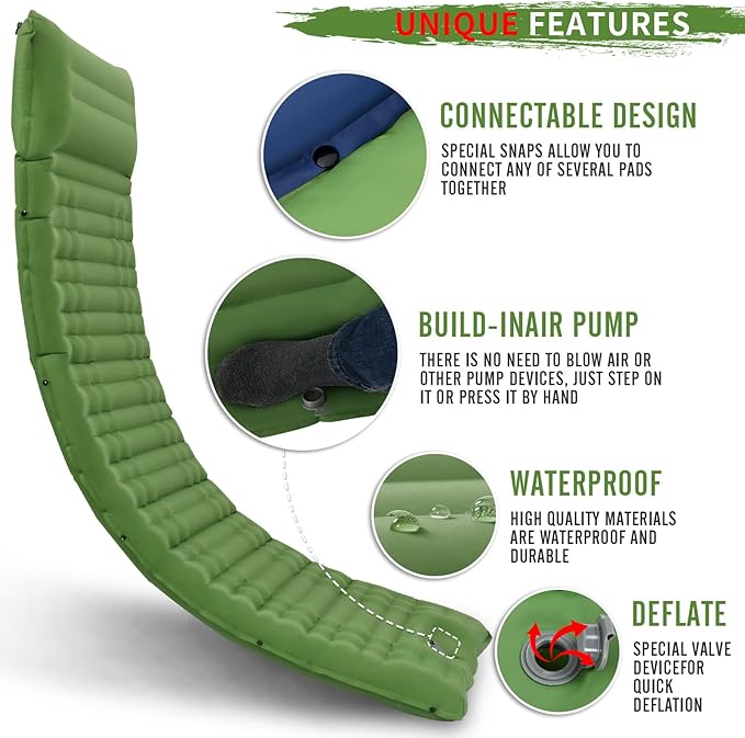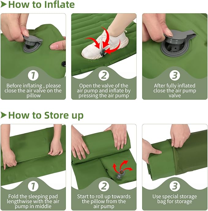 - 【Quick and Easy Inflation】 Simply stomp or hand press to inflate.No need to blow the sleeping pad up with your mouth anymore.With an upgraded quick-inflate pump, the pad inflates in less than 60 seconds.The newest single-layer air release valve design, just open the deflation plug, only need 1 sec achieve super quick to deflate.