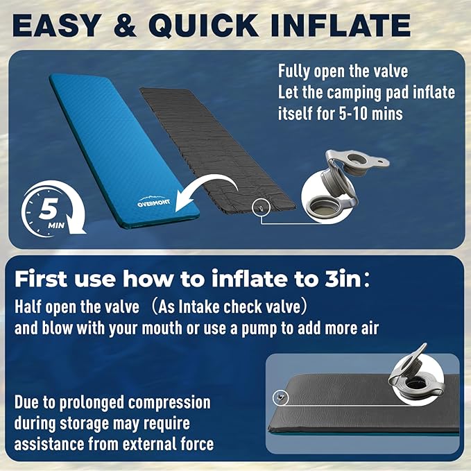 - 【QUICK SELF-INFLATING】Due to the dual-valve design and highly resilient foam, just open both valves to allow the sleeping pad to quickly inflate and deflate on its own,easily roll the sleeping pad into a compact size and store in the included carrying bag. 𝐍𝐎𝐓𝐄: 𝐃𝐮𝐞 𝐭𝐨 𝐯𝐚𝐜𝐮𝐮𝐦 𝐩𝐚𝐜𝐤𝐚𝐠𝐢𝐧𝐠, 𝐟𝐢𝐫𝐬𝐭 𝐢𝐧𝐟𝐥𝐚𝐭𝐢𝐨𝐧 𝐦𝐚𝐲 𝐭𝐚𝐤𝐞 𝐬𝐨𝐦𝐞 𝐭𝐢𝐦𝐞.