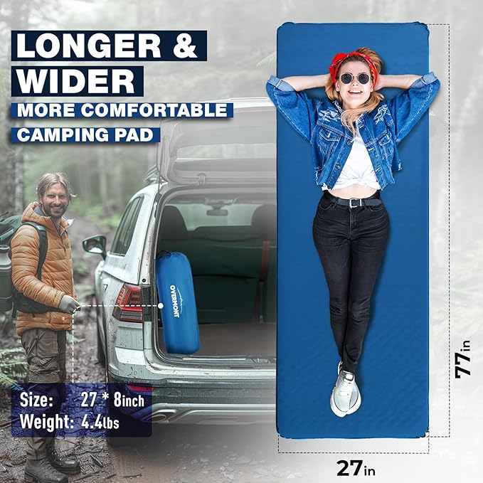 - 【EXTRA THICK CAMPING PAD】Unlike other thin foam sleeping mattress,Overmont camping sleeping pad measures 𝟕𝟕"𝐱 𝟐𝟕" 𝐱 𝟑.𝟏" when inflated, 𝟑.𝟏 𝐢𝐧𝐜𝐡 𝐭𝐡𝐢𝐜𝐤𝐧𝐞𝐬𝐬 provides more comfort and room.This camping mattress will always keep you off the ground, no matter what sleeping position you are in. Please stop using cheap sleeping pad, Overmont camping sleeping pad let you enjoy every great night on your outdoor travels.