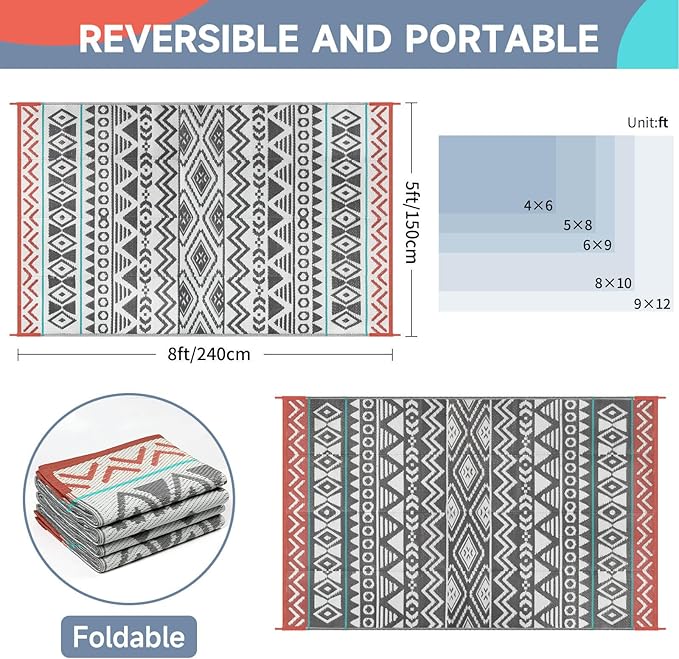 - ๐๐๐ฏ๐๐ซ๐ฌ๐ข๐๐ฅ๐ ๐๐ฎ๐ : Our outdoor patio rugs for beach trips and porches are crafted from 100% polypropylene with dual-sided usability. Featuring heat-sealed edges to resist fraying, the ventilated design ensures compatibility with most outdoor surfaces