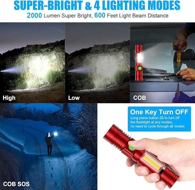 - Super bright LED Rechargeable flashlight, 2000Lumen, 4Modes: Super Bright Rechargeable Flashlight delivery a high output 2000 Lumen Max that the beam distance can be up to 600ft, zoomable function help this Magnetic LED Flashlight can be fully zoomable from large area floodlight to focused spotlight flash light; LED Tactical Flashlight have 4 Modes:High / Low / COB SOS/ COB sidelight modes ,SOS mode keep you always safe in any emergency situation.