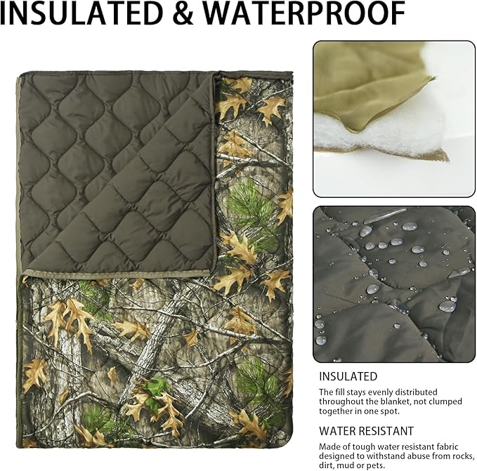 - PACKABLE & PORTABLE- The poncho liner measures 5x6.5ft /60x78.7in , enough space for four people to sit and two to lie down. Comes with a compression bag with heavy-duty clasps that can be compressed to a small size, easy to keep in your car or on camping trips.