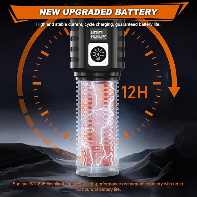 - 【FLASHLIGHTS HIGH LUMENS 980000】Sunitact ST1695 flashlight is equipped with an ultra-bright upgraded XHM77.2 chip, which can reach a maximum brightness of 980,000 lumens. Since the light penetration is stronger than other lamp beads', its beam can pass through the dust and fog well, comparable to car fog lamps, especially suitable for foggy days and rainy days with low visibility. This led flashlight can easily illuminate an 2160-square-foot room or focus on objects up to 3938 feet away.