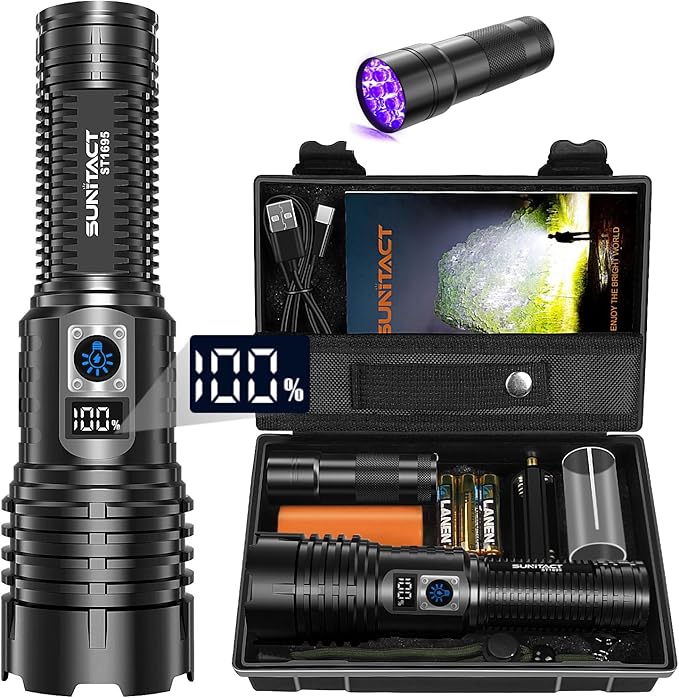 - 【PACKAGE LIST & AFTER-SALES SERVICES】What you will get : 1x Sunitact ST1695 powerful flashlights, 1x UV blacklight flashlight, 1x Powerful battery and USB charging cable, 3x AAA Batteries, 1x Lanyard and holster, 1x Manual and Gift box. You will be pleasantly surprised by the brightness, quality, longevity and performance of the flashlights high lumens battery powered. If you have any questions about the usb flashlight, please feel free to contact us. We will be happy to answer your questions.