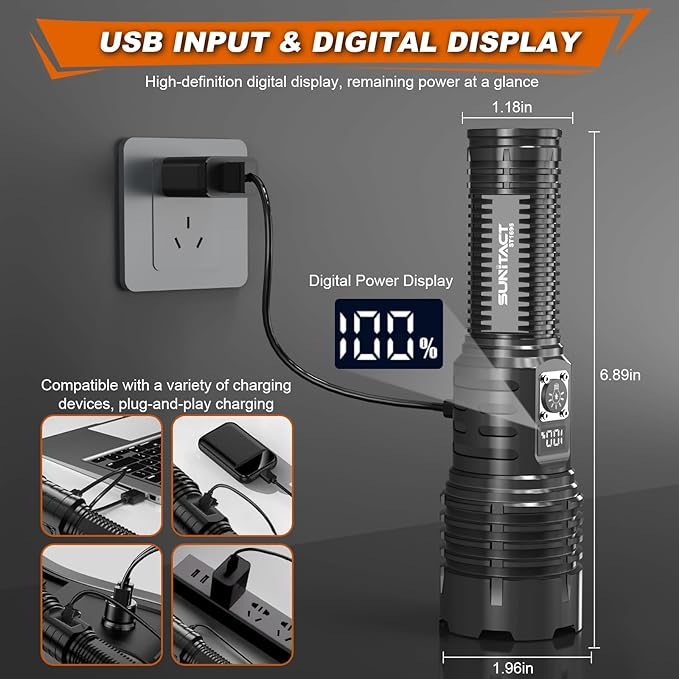 - 【LCD POWER DISPLAY | USB INPUT | USB OUTPUT】This rechargeable flashlights has been newly upgraded with the unique LCD power percentage display, at a glance, you can always grasp the remaining power. As well, this flash light has been completely improved to shorten the charging time and extend the service life, which can provide up to 12 hours (Low mode) of powerful, non-diminishing brightness. Built-in usb interface, It's more convenient to charge. It can also charge the phone in emergency.