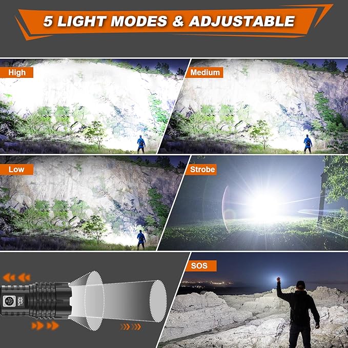 - 【UPGRADED 5 MODES & ZOOM FLASHLIGHT】The brightness of 5 modes(High/Medium/Low/Strobe/SOS) changes gradually instead of changing instantly, which can avoid the sudden irritation to the eye, therefore it can protect our eyes. The smooth current transition system can also better protect super bright flashlight components, thus extending the service life. By pulling and pushing the head of the flashlight, the functions of large-area floodlight and concentrated long range spotlight are realized.