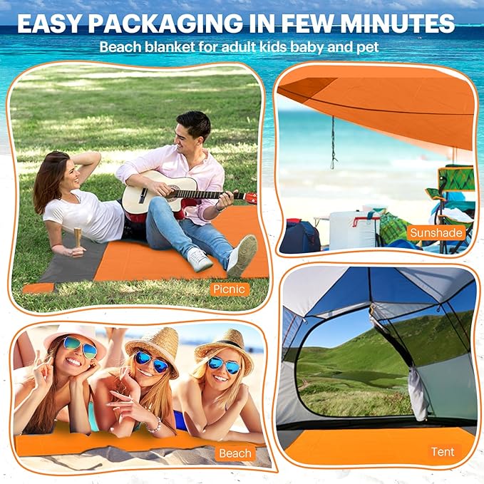 - Skin-friendly waterproof beach mat: Sewn polyester fabric, it has good wear resistance and dries quickly, improving your comfort at the beach or outdoor activities. Let your family and friends enjoy the sea and sun on the summer beach!