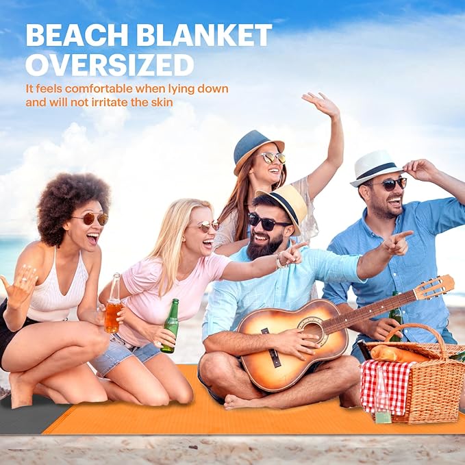 - LARGE SIZE DESIGN: The extra large beach mat is specially designed for family travel, providing enough space to lie down, rest and relax. Beach mat waterproof set includes 1 beach blanket, 4 stakes, 1 carabiner. Beach blanket measures 79" x 83", sleeps up to 7 adults, and weighs 12 oz.