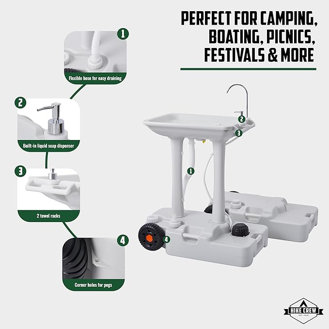 - PERFECT FOR CAMPING, BOATING & FESTIVALS | Hike Crew’s Versatile Personal Care Equipment Stands Up to Frequent Use & Suits a Variety of Outdoor Settings & Events Where Plumbing/Running Water is Not Available | Use Your Portable Sink & Waste Tank for Camping & Fishing Trips, RV Outings, Picnics, Concerts, Parties, Tailgates & Sporting Events