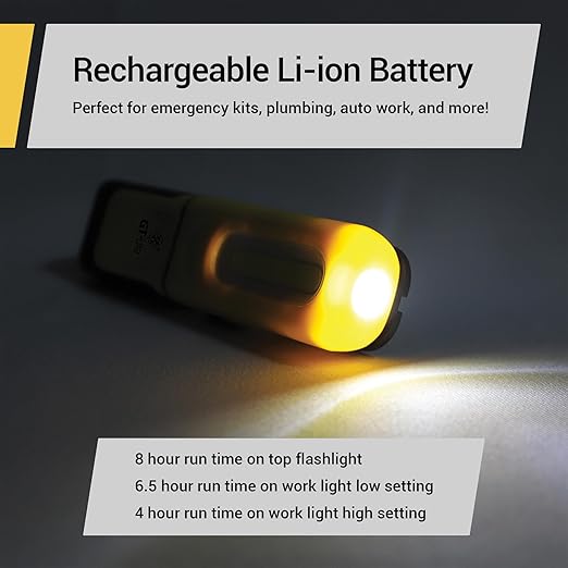 - Up to 8 hours of run time: 8 hours run time on the top flashlight, 6.5 hours run time on work light low setting, Ideal for job sites, home repairs, and outdoor activities, this durable and reliable work light ensures you’re never left in the dark.