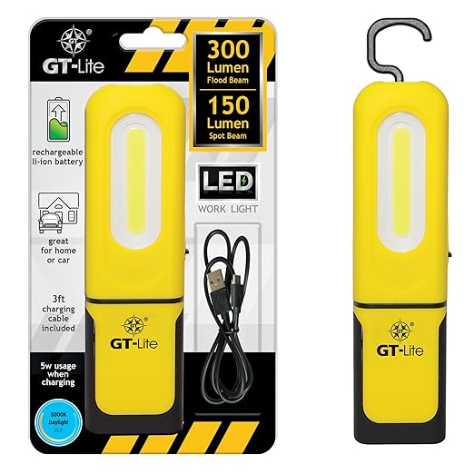 LED Rechargeable Work Light 300 Lumen Flash Light, 6ft Cable, Hanging Hook, Magnetic Base, Kickstand, 3 Settings, High/Low/Flashlight, Emergency Kits, Camping Light, Utility, Plumbing Light