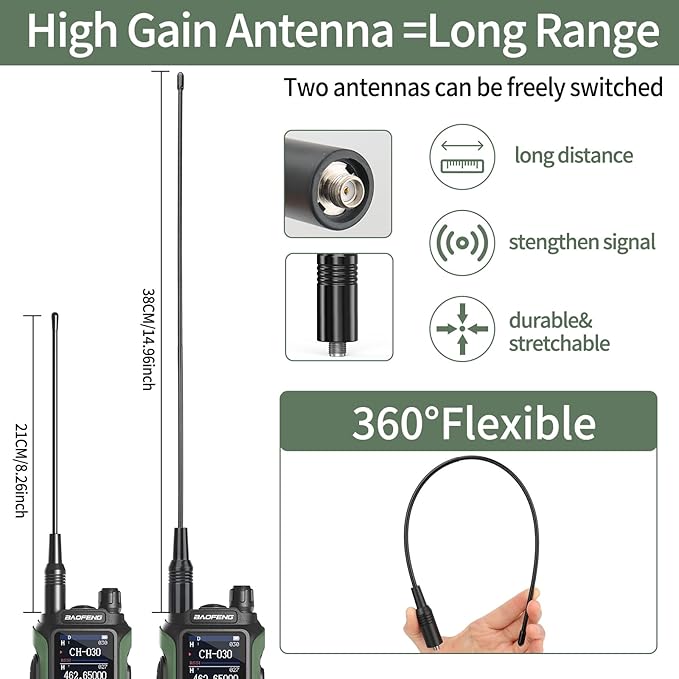 - 📦【Package Included】1XRadio; 1XBattery; 1X21CMAntenna; 1X38CMAntenna; 1XHeadset; 1XUSB-C Charging Cable; 1X Base Charger; 1XBelt; 1XLanyard; 1XManual. (📢Kindly Tips:If you need programming software you can contact our after-sales service, we will actively cooperate with you)