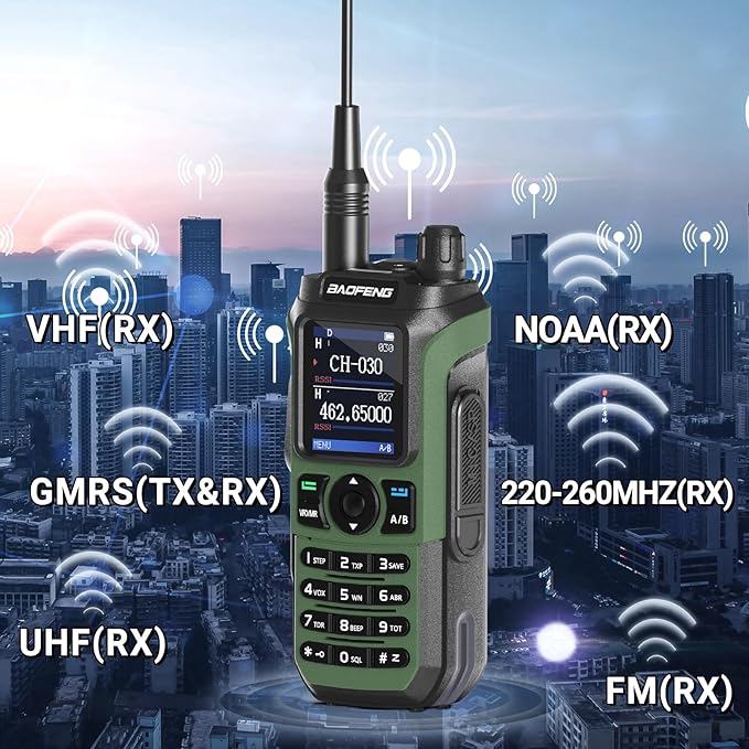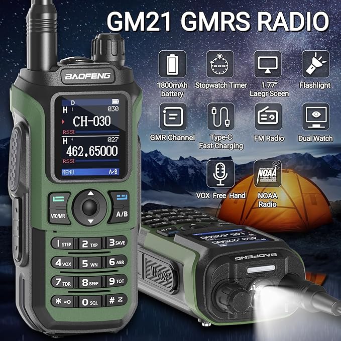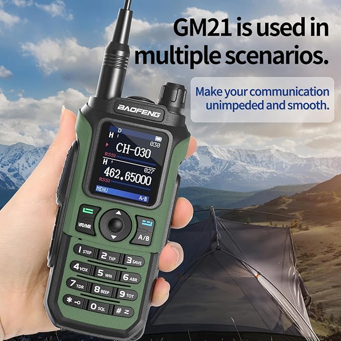 - 💪【Professional GMRS Ham Radio】The walkie talkie can reach the highest output power level of GMRS handhelds , which will help to get stronger signals and reach longer distances. VOX function can achieve hands-free operation while driving. It is comes with 30 GMRS channels and 10 NOAA weather channels, compatible with FM/UHF/220-260MHz/VHF(only receive), providing comprehensive communication options. FCC ID: 2AJGM-GM21. Support Chirp (Compatible programming software: GM-5RH).
