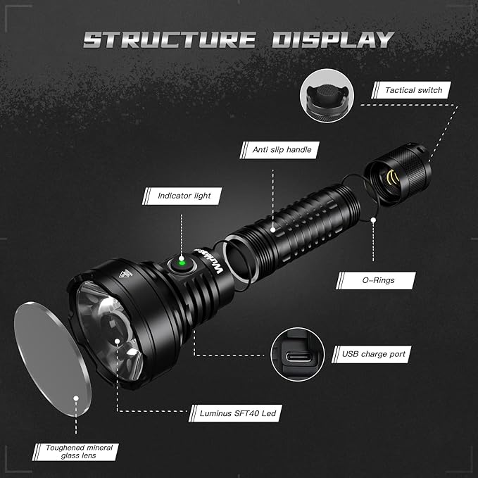 - 🔦【Advanced Technology】Wurkkos multifunctional LED super bright flashlight has many amazing functions,pointed head design, tactical flashlight can be used as a safety hammer, USB-C fast charging, super bright max1800 lumens, long distance 3280ft/1000m, Tactical Mode, General Lighting Mode, Two Group User Interface, IP68, Advanced Temperature Regulation Technology (ATR). In today's accident-prone world, safety is always our top priority.