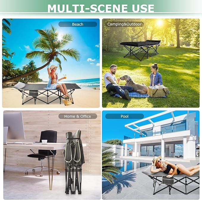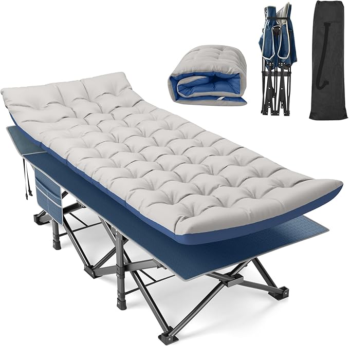 - 【Built-in Pillow Design】The headboard of our cot is a slanted design with built-in pillows, no need for extra pillows. The slight incline is ergonomically designed to ensure no more back, neck or shoulder pain in sleep! The mattress is also soft and thicker, so this is a very comfortable folding camping cot