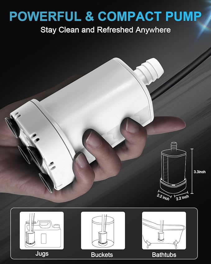 • COMPACT & PORTABLE --- Shower pump only 2.2*2.2*3.3 inches, makes it easily fit most jugs mouth. The shower's bottom suction design with four suction feet, which can be hold the bottom of the water bucket firmly.