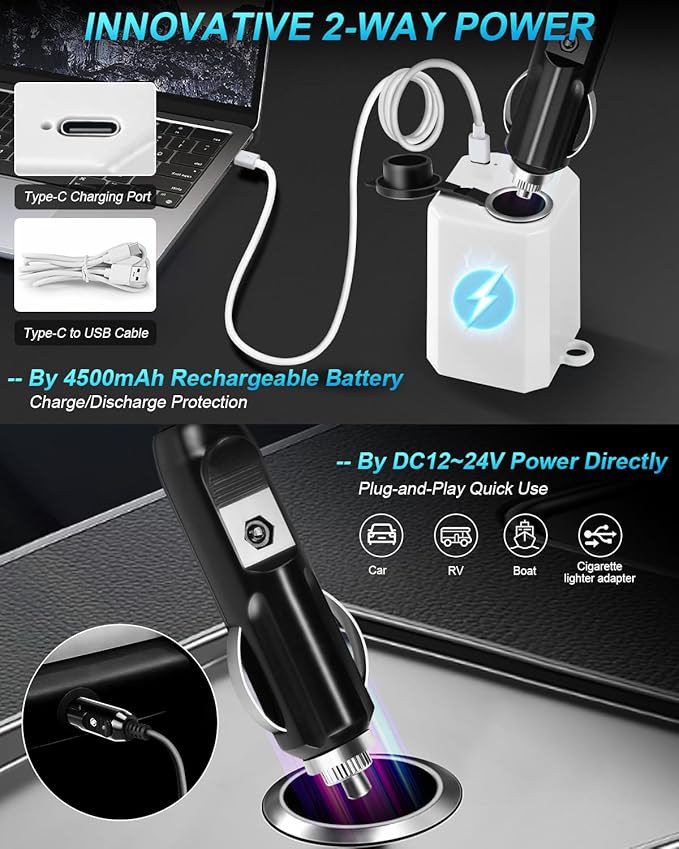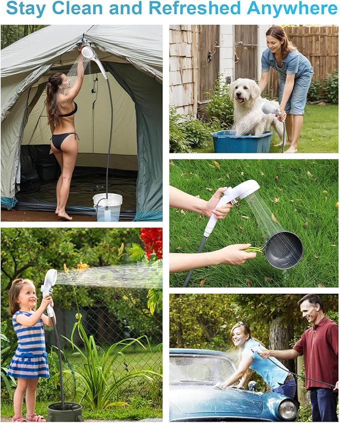 • MULTI-FUNCTIONAL PORTABLE SHOWER --- No more compromising. We offer two ways shower to get power, either with a removable battery that shower pump can work for up to 90-120 minutes with a full charge, or plugging into the cigarette lighter to get a constant power.