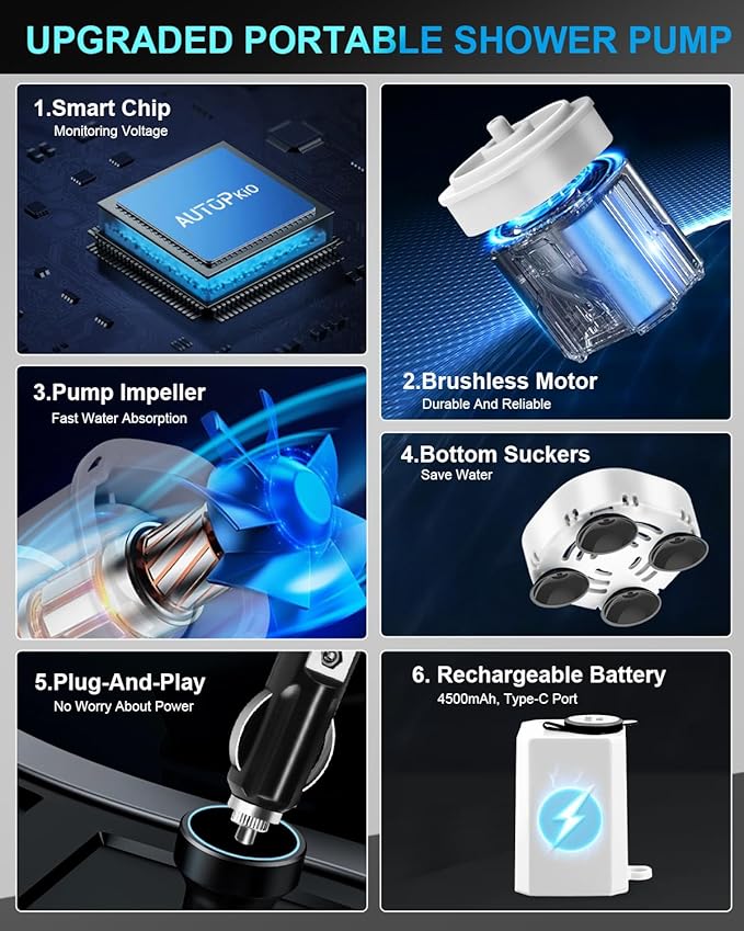 • SAFE & RELIABLE --- With Exclusive brushless motor, combined with smart chip that monitoring voltage, current, and temperature to keep shower pump running for more safety,long life. The AUTOPkio camping shower is the ideal rinse kit for all your off-grid adventures.