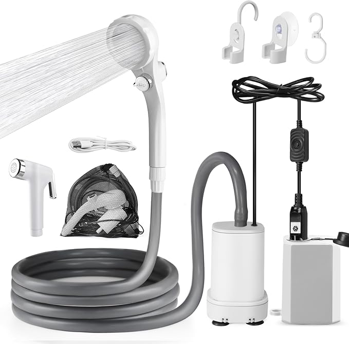 • WHAT'S IN THE BOX -- Shower pump,Adjustable shower head, Spray, USB-C cable, 4x bottom suckers, Food-grade silicone hose, 1x 5m Adapter cord, 2x Rubber rings (one is originally installed on the hose, the other is for replacement), 1x Showerhead holder, 1x Hook for shower holder, 1x S-shape hook, 1x Storage bag, 1x User manual