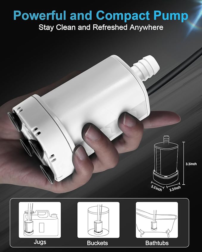 • COMPACT DESIGN -- With a compact size of 2.5 × 2.5× 3.1 inches, portable shower pump is designed to fit easily into jugs, buckets and so on. Equipped with a mesh pocket to easily pack camping shower kit, making it convenient for travel and ensuring you always have refresh shower on the go.