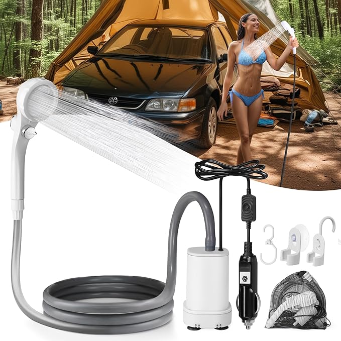 • PLUG-AND-PLAY -- Simply plug into cigarette lighter socket, place the shower pump in your water source, then turn it on to get instant shower stream.Durable brushless motor pump is suitable for family camping, outdoor activities, bathing your dog, watering plants, and emergencies.