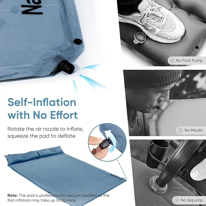 - 【Fast Inflation】Rotate the nozzle to inflate the pad automatically. After that, give a few puffs for a fuller pad. To deflate, squeeze the air cushion. Note: The pad is professionally vacuum packed so the first inflation may take up to 20 mins