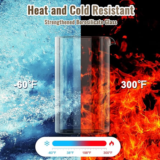 - Sturdy Materials: Made of heat-resistant borosilicate glass, high-quality 304 stainless steel, plastic, ensuring rust and corrosion prevention, anti-deformation, and long-lasting use. And the BPA Free plastic on the grip prevents burns.