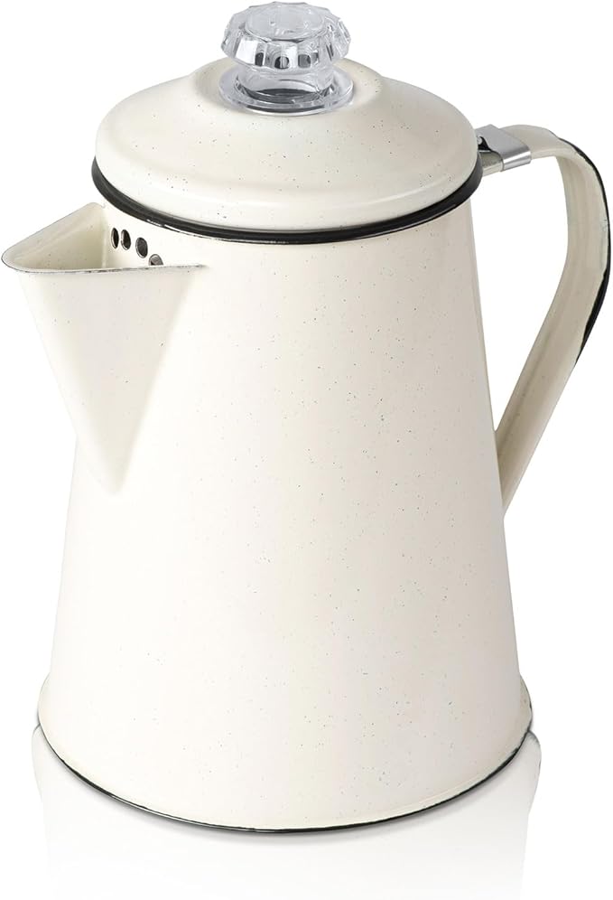 - STYLISH & FUNCTIONAL: Complete with a bright stainless steel rim and an unbreakable resin viewing cap, this enamelware coffee pot combines vintage charm with modern functionality in a distinctive cream hue.