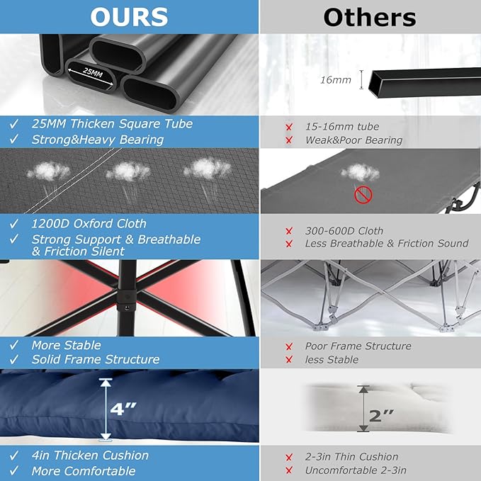 - 【Premium Material】Suteck adults camping cot bed is made of 25mm square anti-rust steel frame, durable 1mm thickened tubing and double layer 1200D Oxford cloth. Superior Strength, Water Resistance & Easy- Cleaning. More durable and supportive than 600D Oxford cloth, it can hold up to 900 lbs. There are 10 support legs, each with non-slip pads, and two right-angle bandages for stability and a comfortable sleep