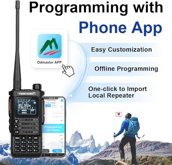 - ③Multiple programming methods: 1️⃣Support Chirp,select "TIDRADIO → TD-H8-GMRS". 2️⃣Manufacturer software/firmware upgrade → visit:walkietalkiesoftware.com 3️⃣Wireless programming → Google Play Store/App Store → Download ‘Odmaster’