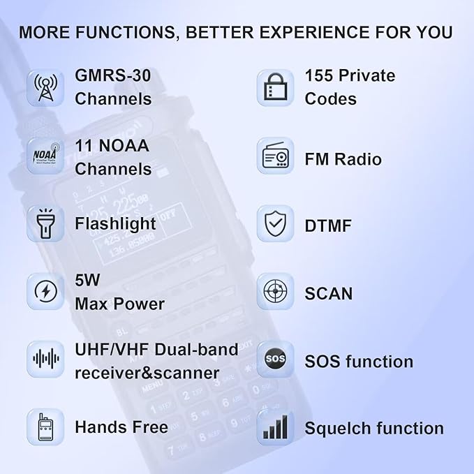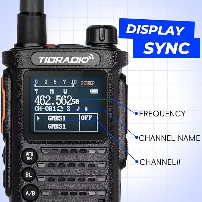 - ②Simple operation: The 1.77in LCD display is easy to read. Most basic settings can be accessed through menus and keyboards. The TD-H8 GMRS radio has 199 CH, 155 private codes (50 CTCSS/105 DCS), wireless programmable, GMRS repeater list, SYNC, VOX hands-free function, NOAA weather, transmit time-out, BCLO busy channel lockout, POC, dual watch, adjustable squelch, scan. More advanced settings are available when using Odmaster wireless programming.
